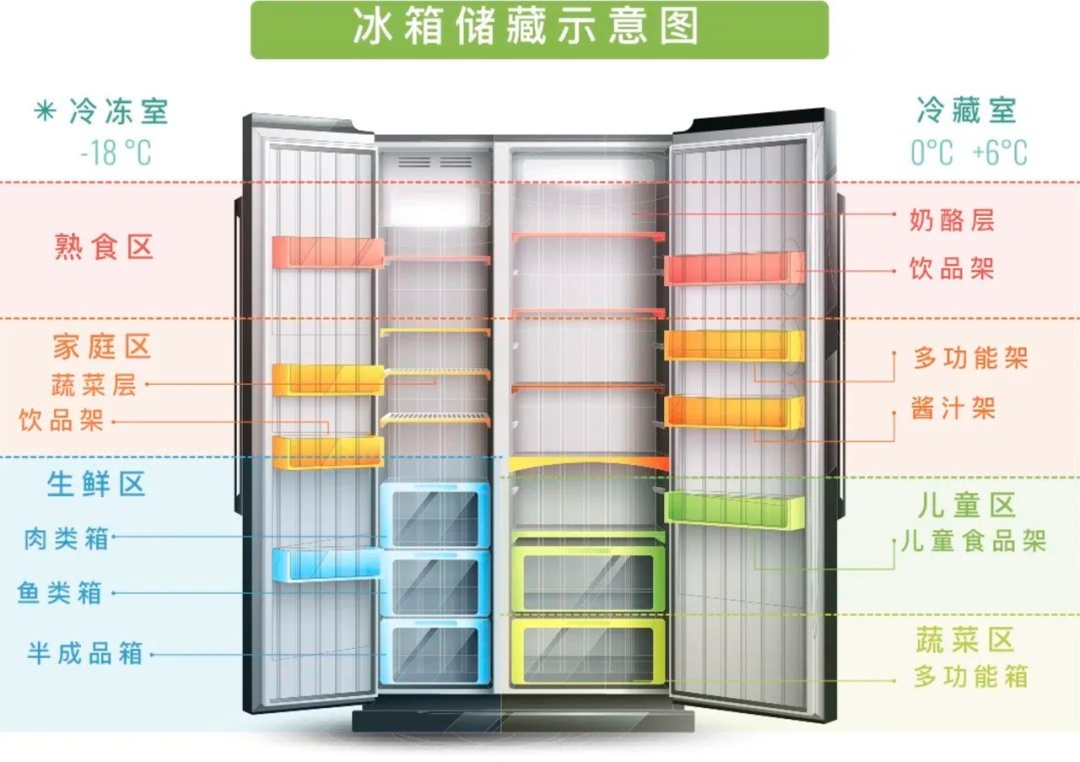 冷藏室:剩饭剩菜、熟食、酸奶、牛奶等放上层;水果、蔬菜放下层。